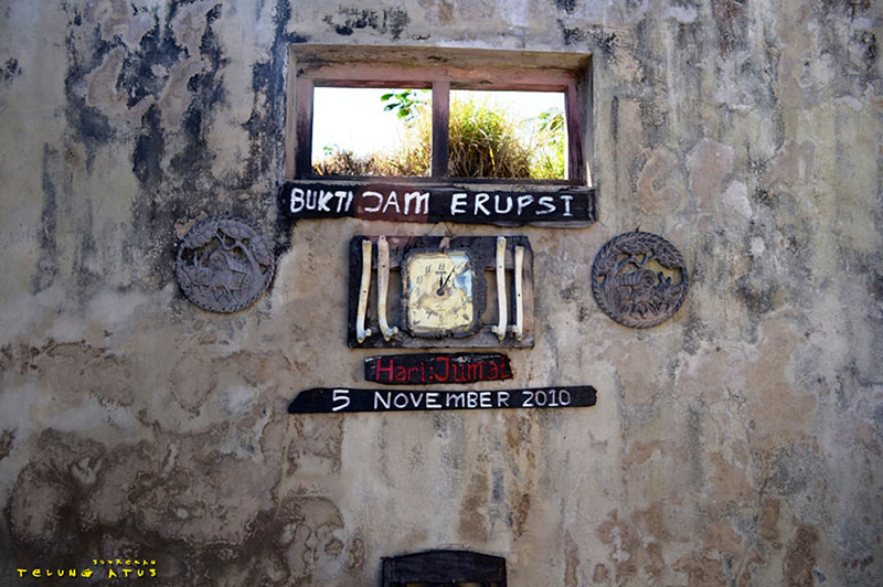 Jam Erupsi, adalah lokasi berikutnya yang kami datangi, sepanjang perjalanan Pak Sopir dengan semangat bercerita tentang Jam Erupsi, tadinya kami masih agak bingung dengan apa yang dimaksud Jam Erupsi itu, tetapi begitu sampai kami baru sadar bahwa yang dimaksud dengan Jam Erupsi adalah Jam atau waktu erupsi yang dhasyat itu terjadi, jam dinding yang menempel di tembok rumah yang telah kusam menunjukkan angka 12:05. saat itu Jumat, 5 November 2010, dini hari awan panas atau wedus gembel melanda rumah ini dan seluruh desa serta desa desa lain disekitarnya. Pada saat itu jam dinding tersebut langsung berhenti berdetak, dan kini, si pemilik rumah seorang Ibu menjadikan rumahnya sebagi museum, masyarakat mengenalnya sebagai Jam Erupsi…