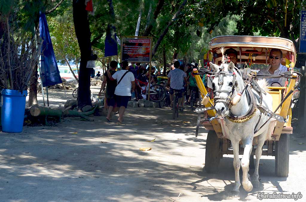Tidak tersedia kendaraan bermotor di Gili Trawangan, Gili Meno dan Gili Air, anda bisa melakukan aktifitas setiap hari dengan berjalan kaki, mengayuh sepeda, berkuda atau menggunakan kendaraan sewaan Cidomo, kereta kuda yang bisa menampung sebanyak 4 (empat) orang.